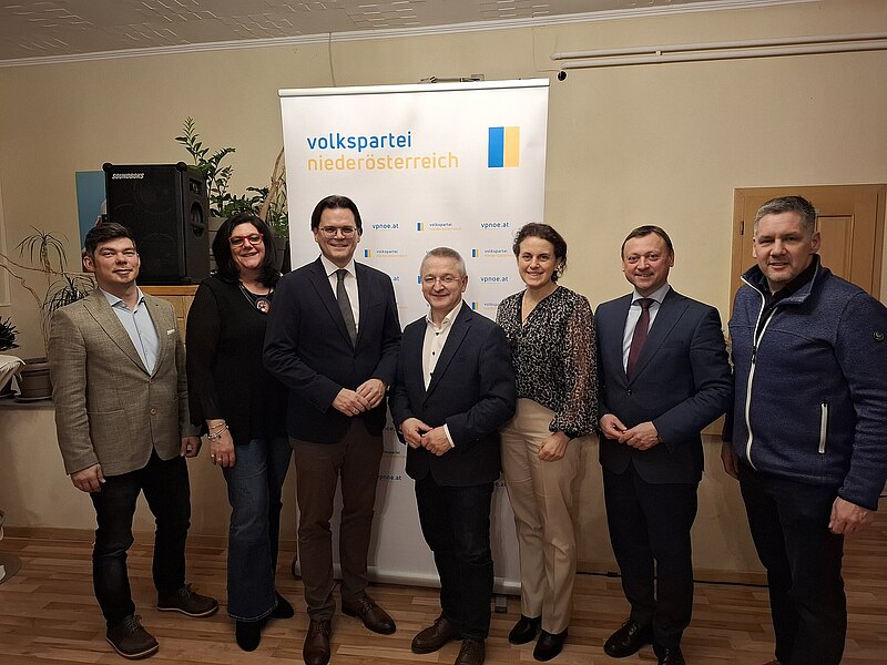 2. Foto Links nach rechts: LAbg. Bernhard Heinreichsberger, Bgm. Gemeindeparteiobmann Bernhard Heinl, Marcel Fischer, Sabine Figl, Bernhard Bürgmayr, NR Bezirksparteiobmann Johann Höfinger und VBgm. Eduard Sanda.